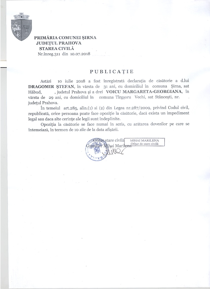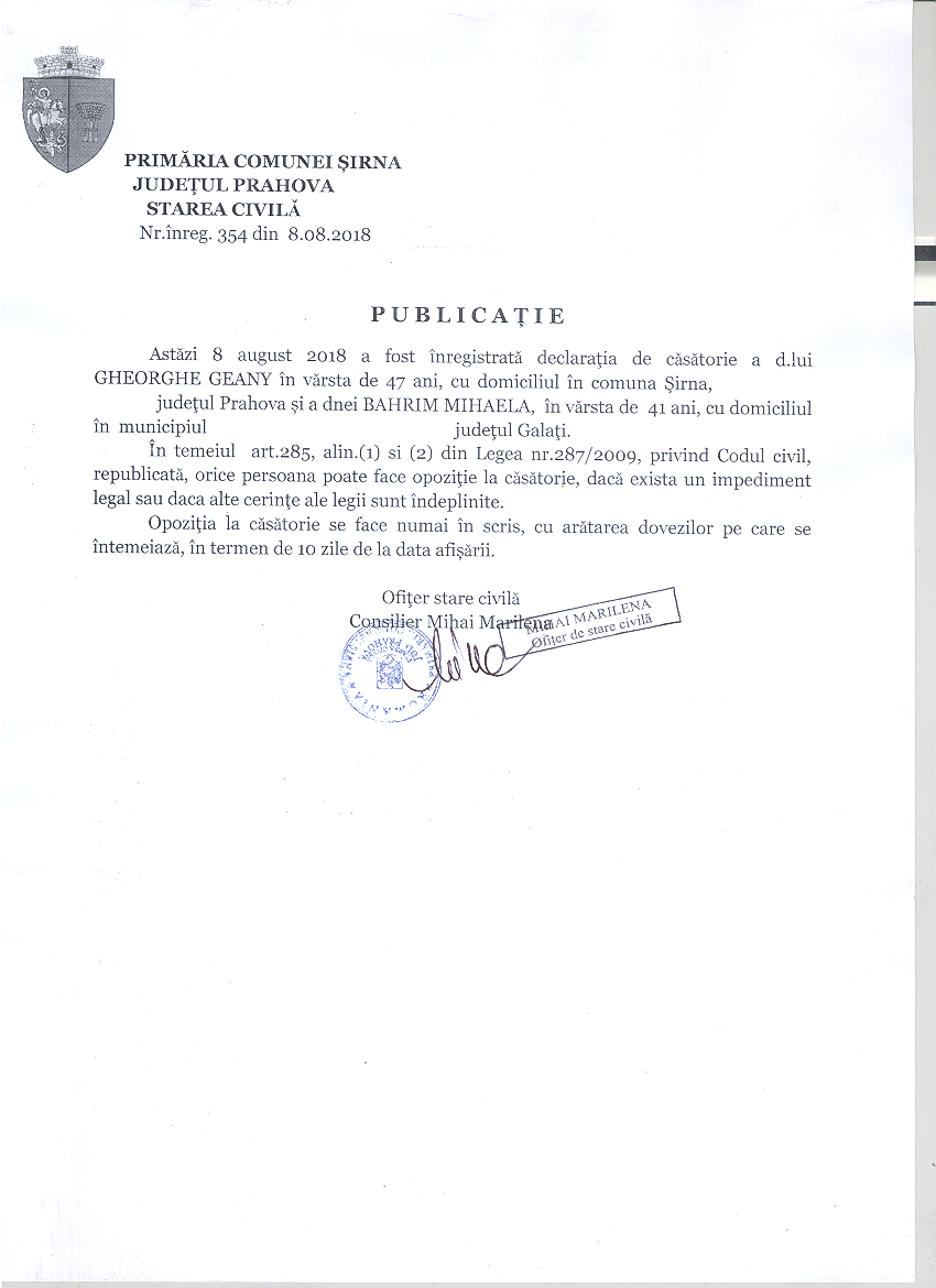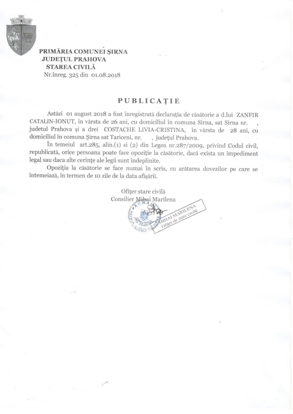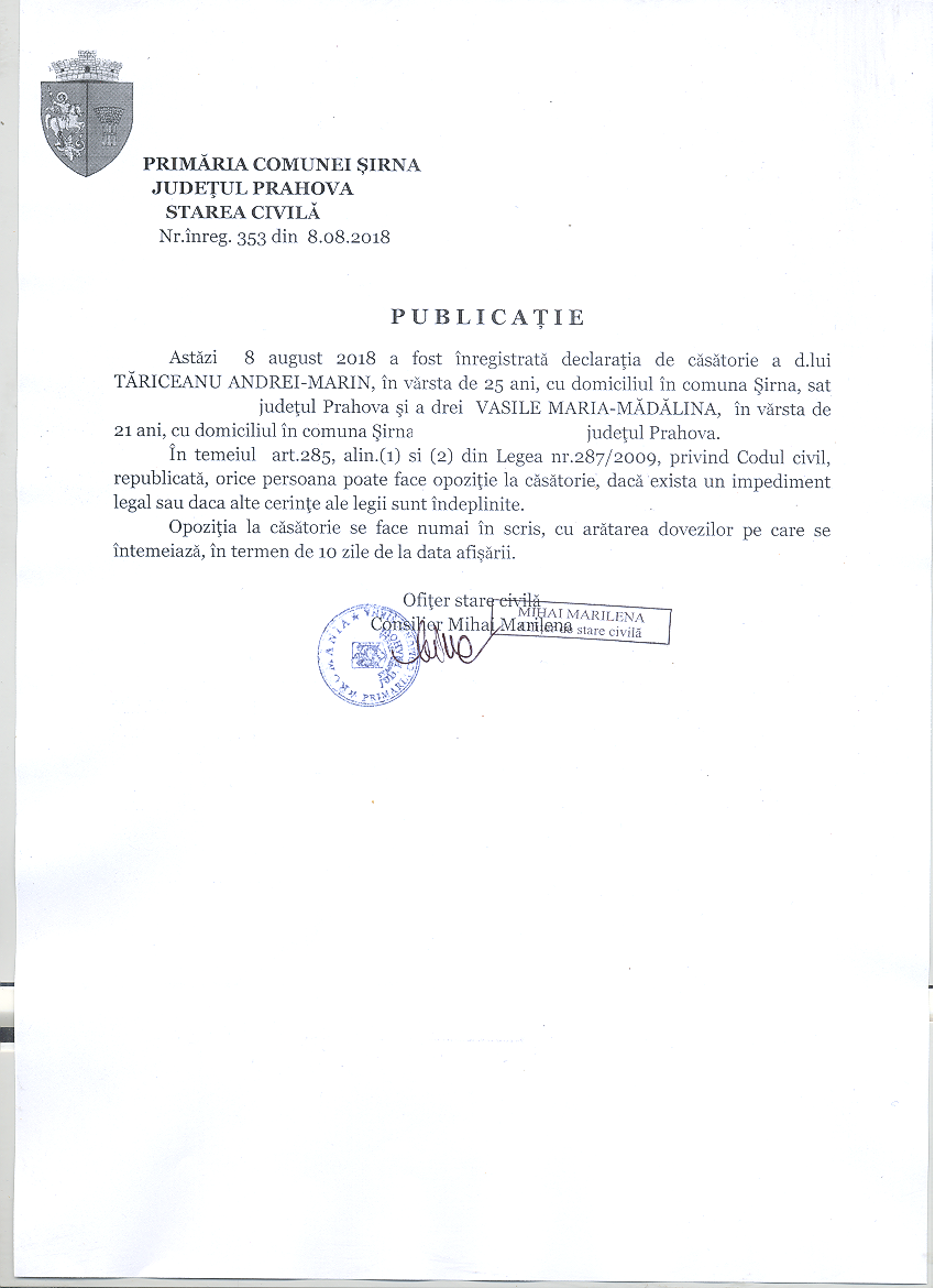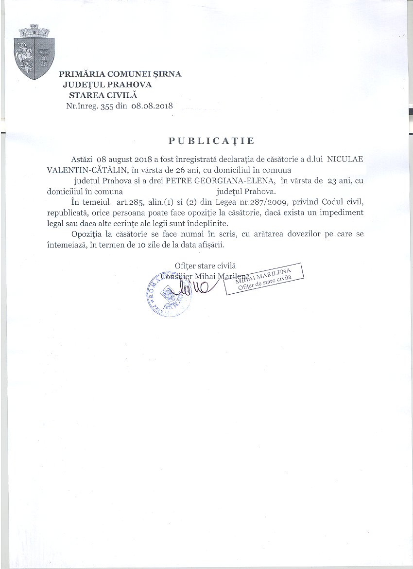 9) Publicatia de casatorie nr. 361 din data de 21.08.2019 (Stoica Silviu Gabriel si Savu Madalina)