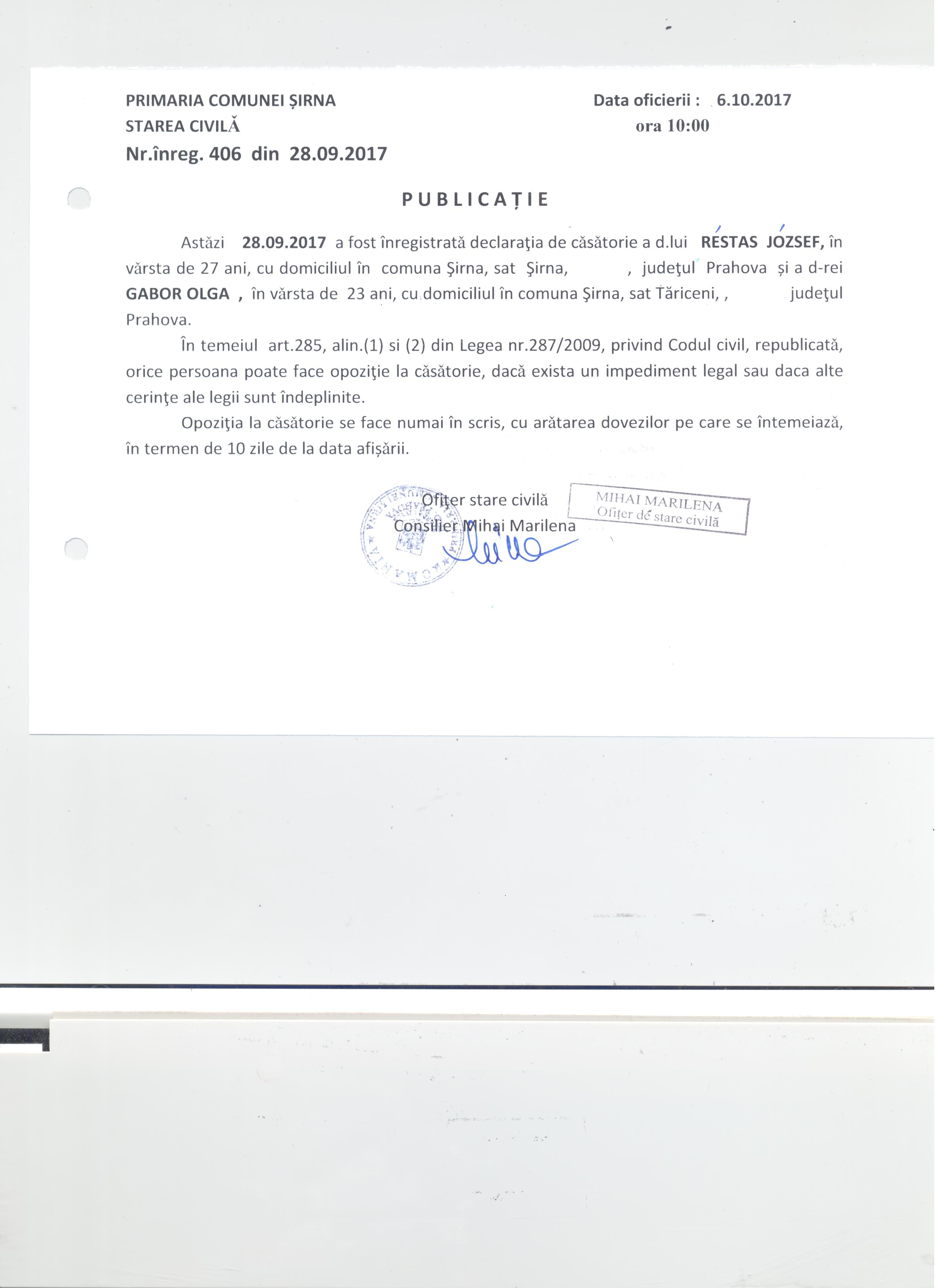 14) Publicatia de casatorie nr. 406 din data de 28.09.2017 (Restas Jozsef si Gabor Olga)