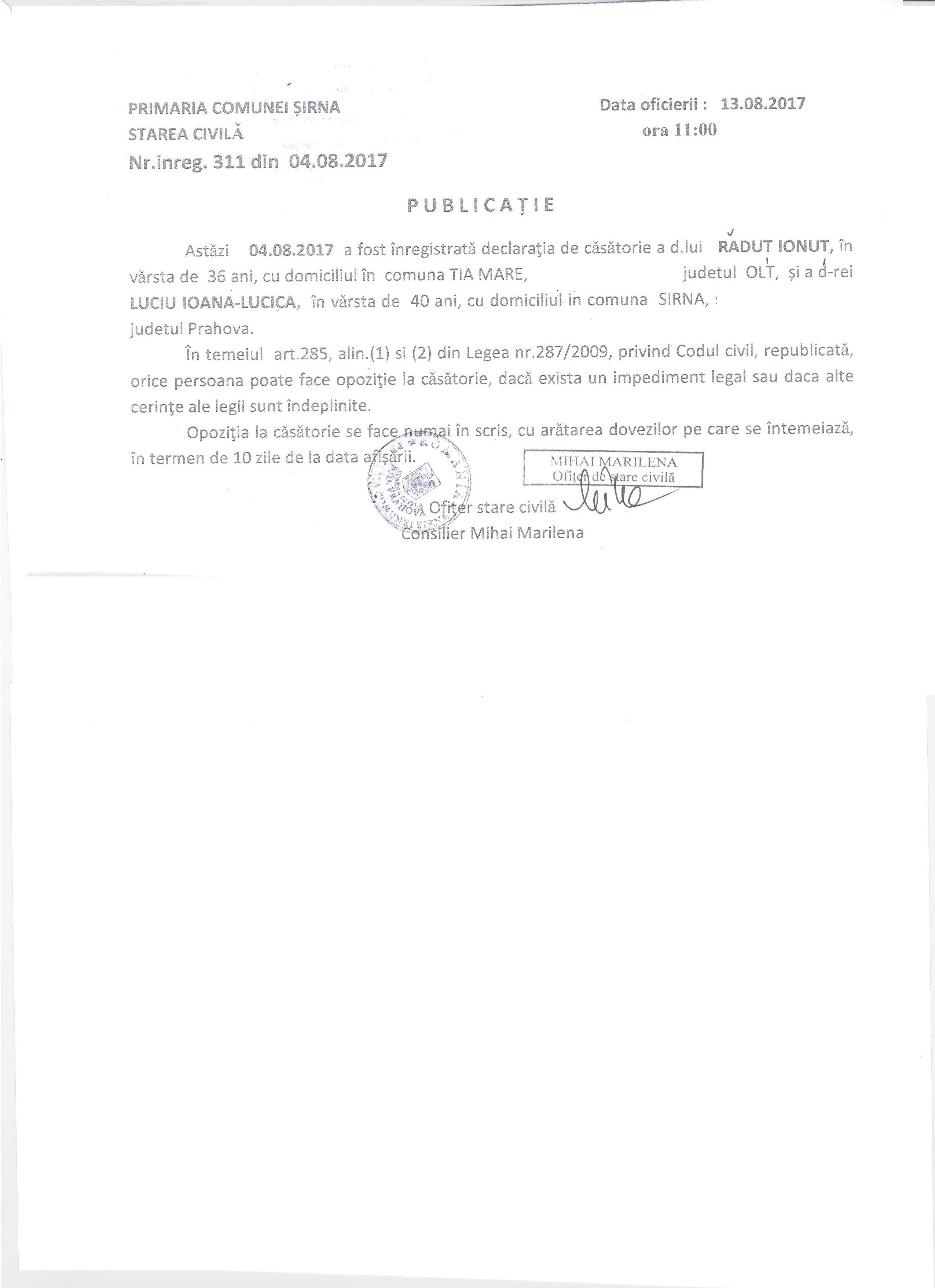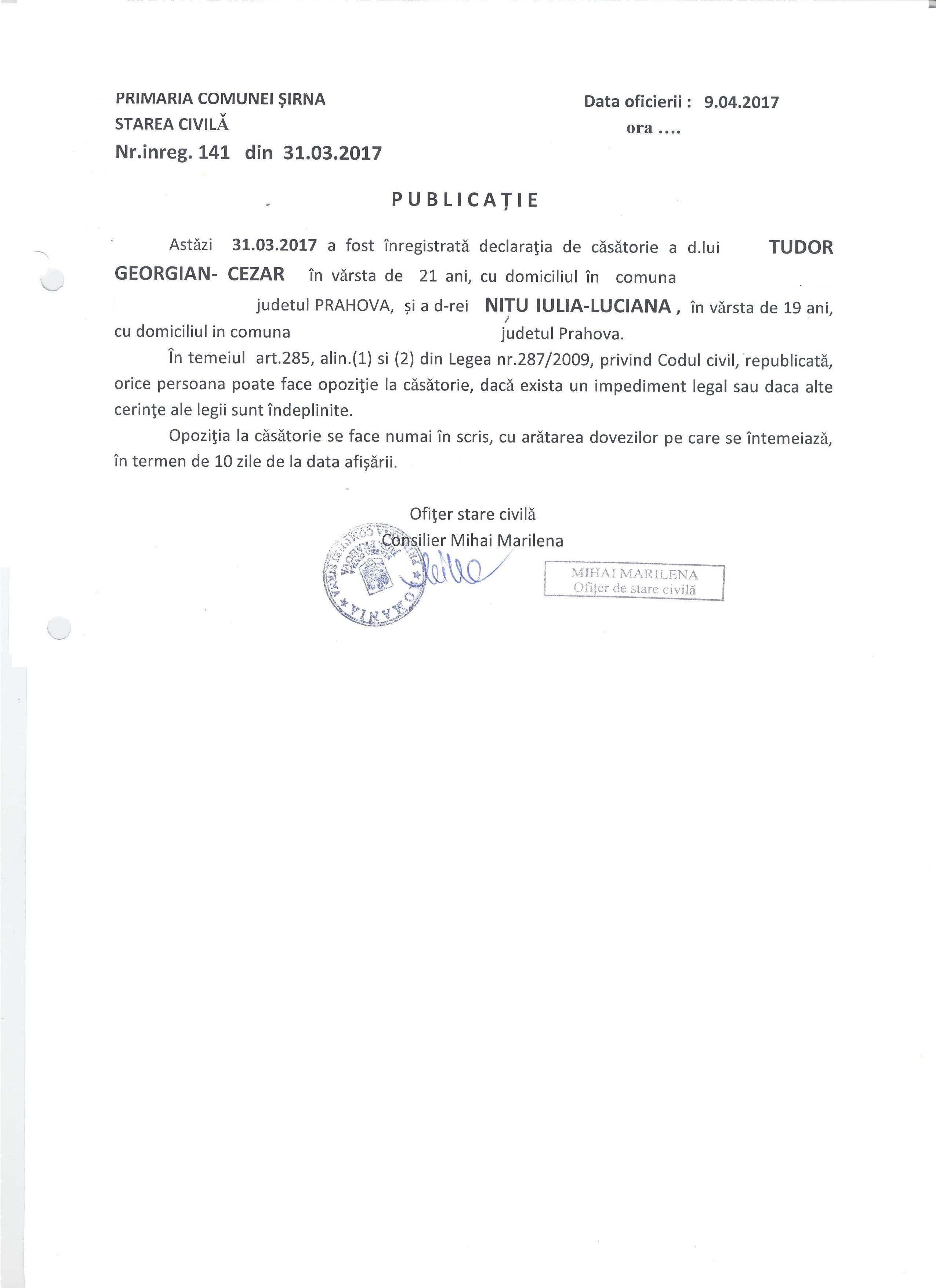 3) Publicatie de casatorie nr. 175 din data de 21.04.2017 (Mic Gheorghe si Țîru Elena-Cosmina)