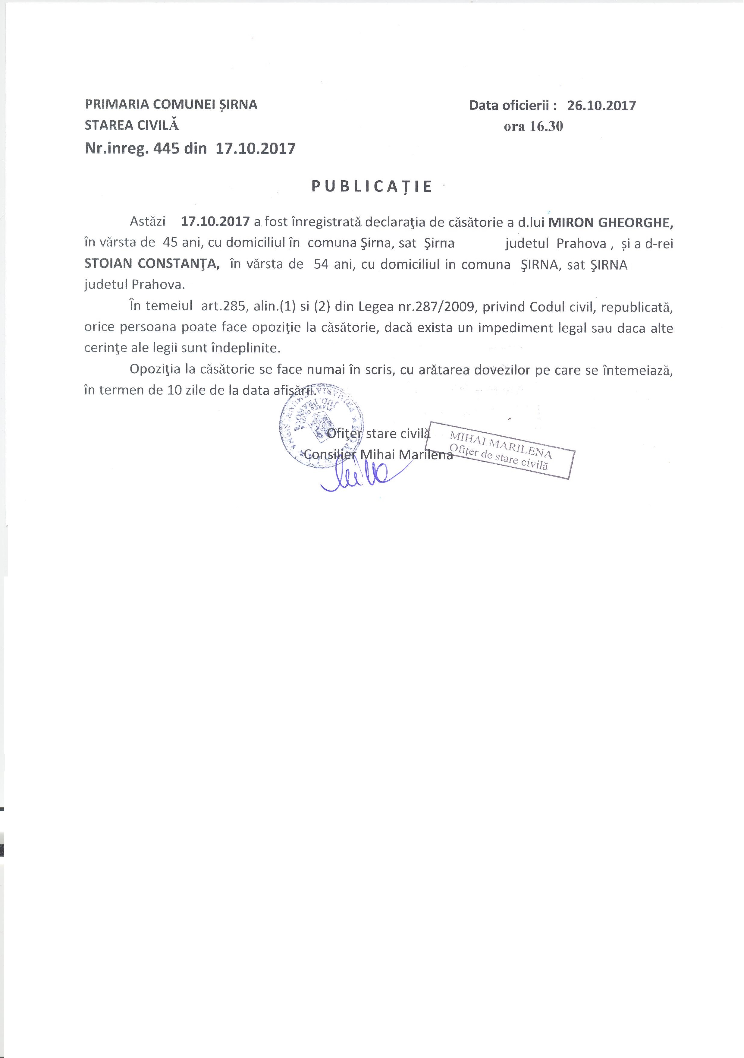 15) Publicatia de casatorie nr. 445 din data de 17.10.2017 (Miron Gheorghe si Stoian Constanta)