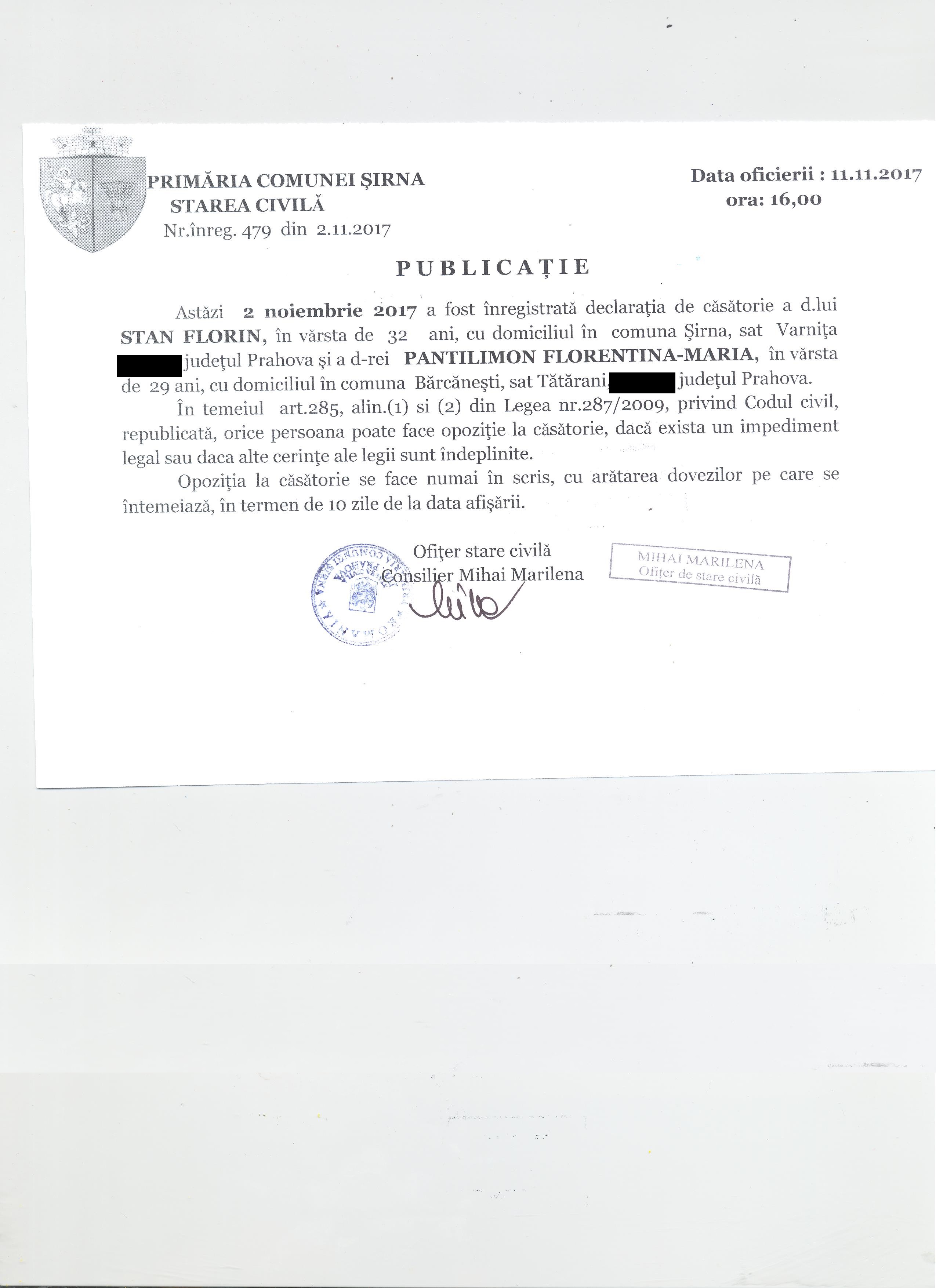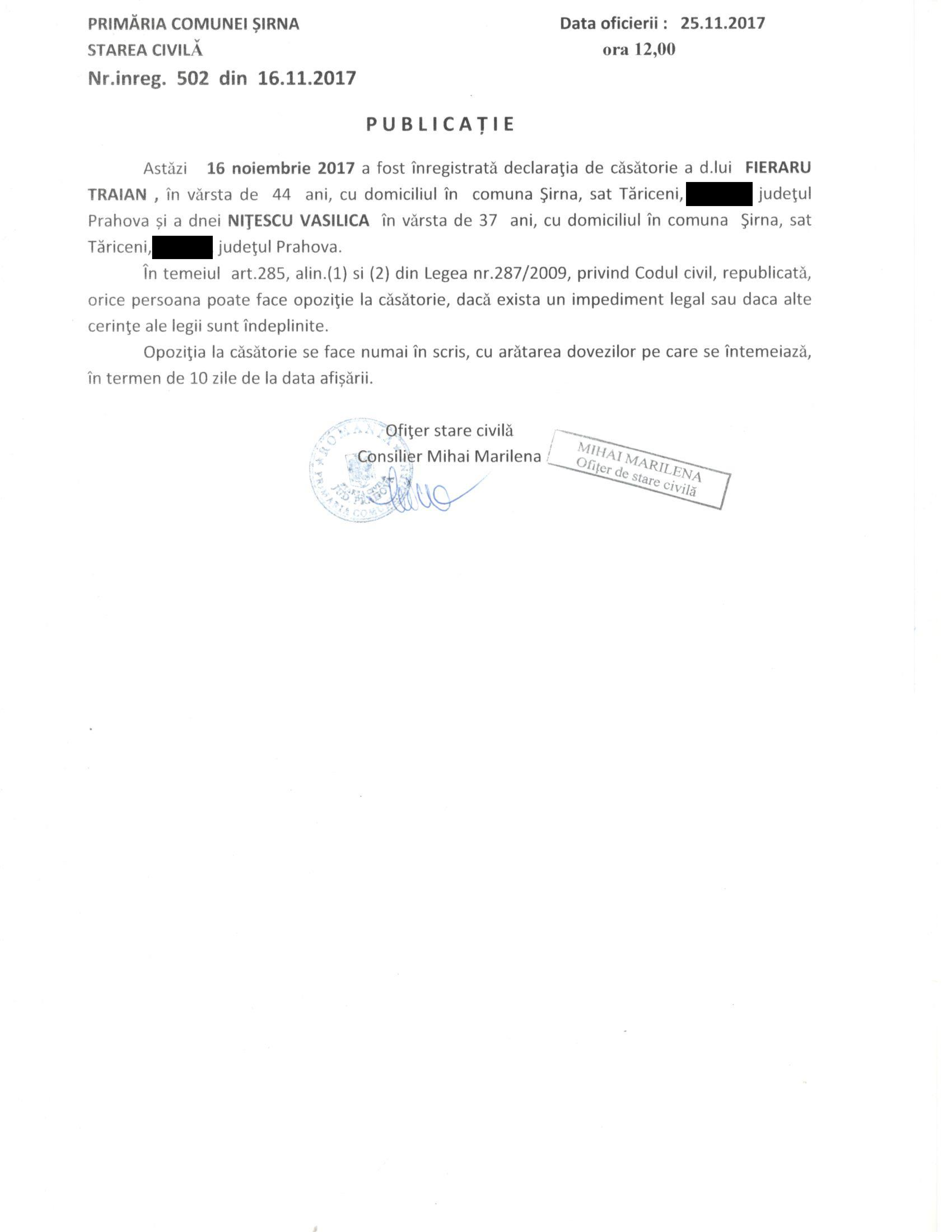 18) Publicatia de casatorie nr. 502 din data de 16.11.2017 (Fieraru Traian si Nitescu Vasilica)