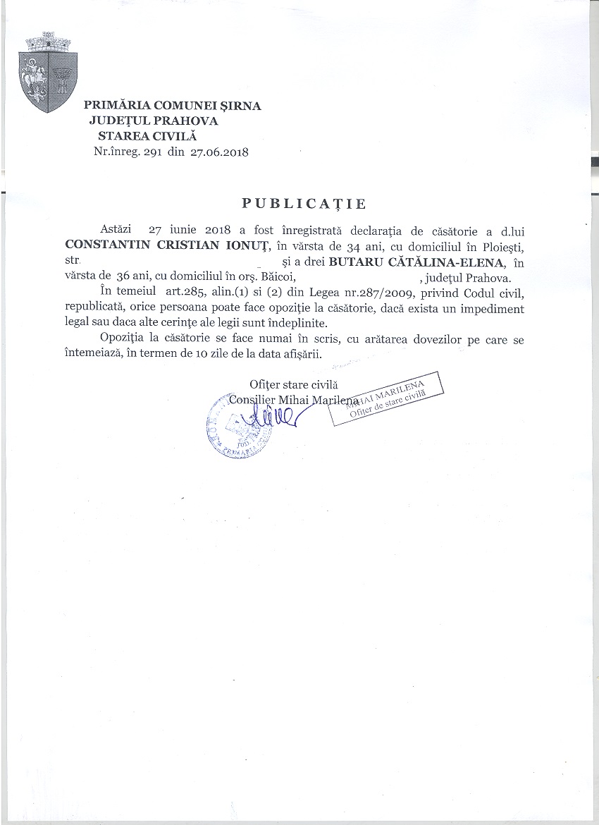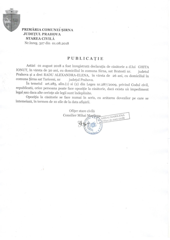 9) Publicatia de casatorie nr. 327 din data de 01.08.2018 (Ghita Ionut si Radu Alexandra-Elena)