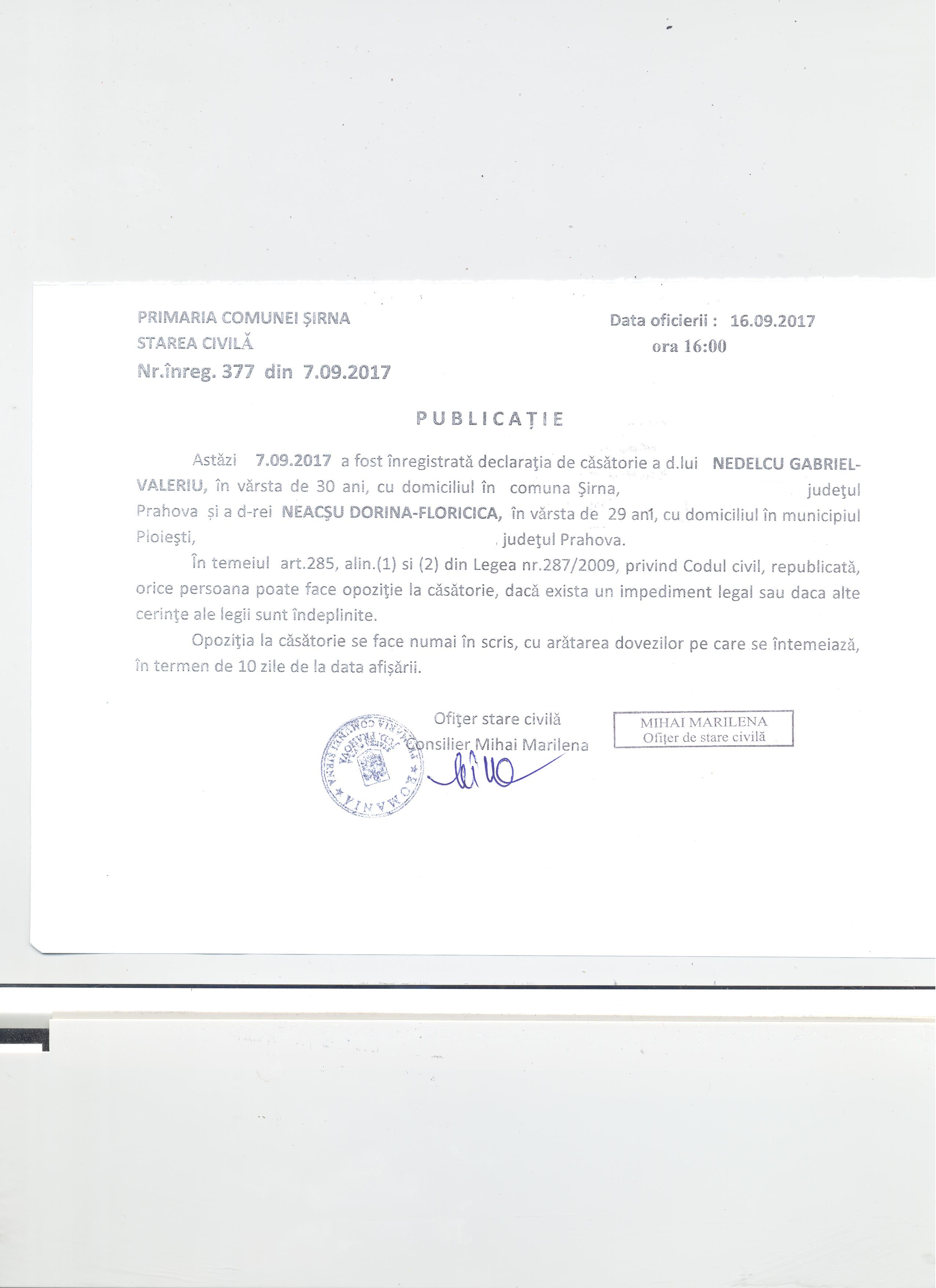 13) Publicatia nr. 377 din data de 07.09.2017 (Nedelcu Gabriel - Valeriu si Neacsu Dorina - Floricica)