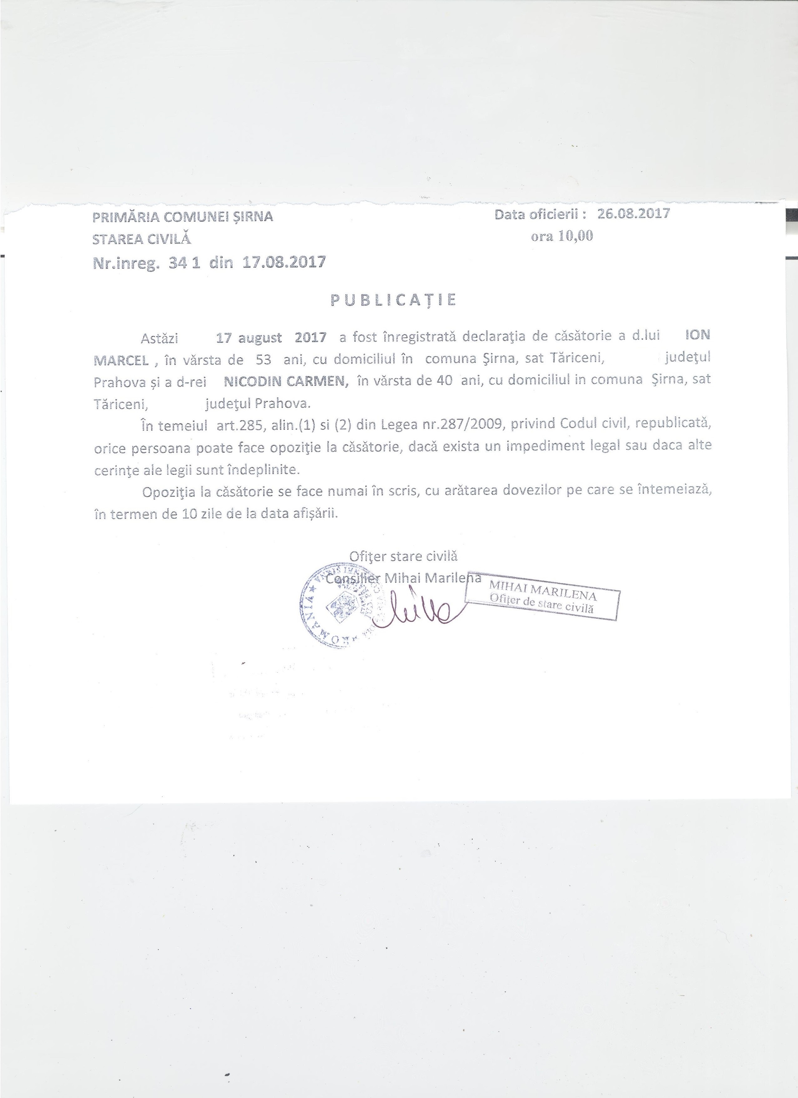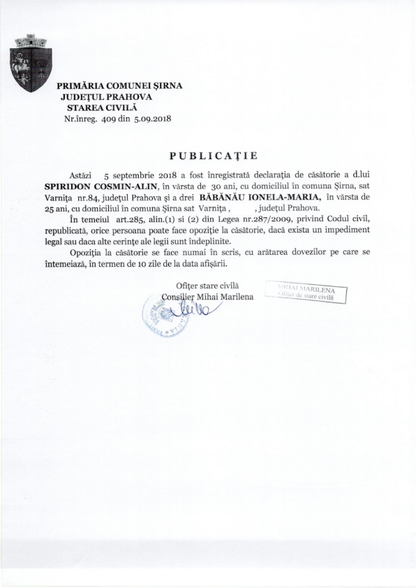 17) Publicatia de casatorie nr. 412 din data de 27.09.2019 (Ionescu Costin si Marin Mihaela Ileana)