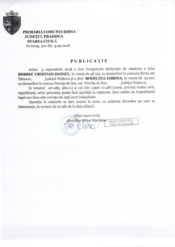16) Publicatie de casatorie nr. 410 din data de 05.09.2018 (Berbec Cristian Daniel si Bohiltea Corina)