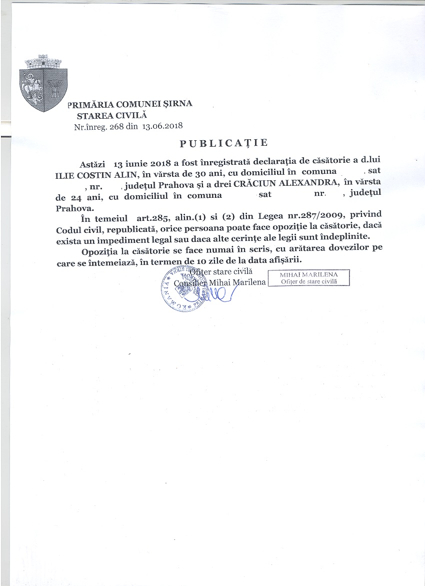 5) Publicatia de casatorie nr. 268 din data de 13.06.2018 (Ilie Costin Alin si Craciun Alexandra)