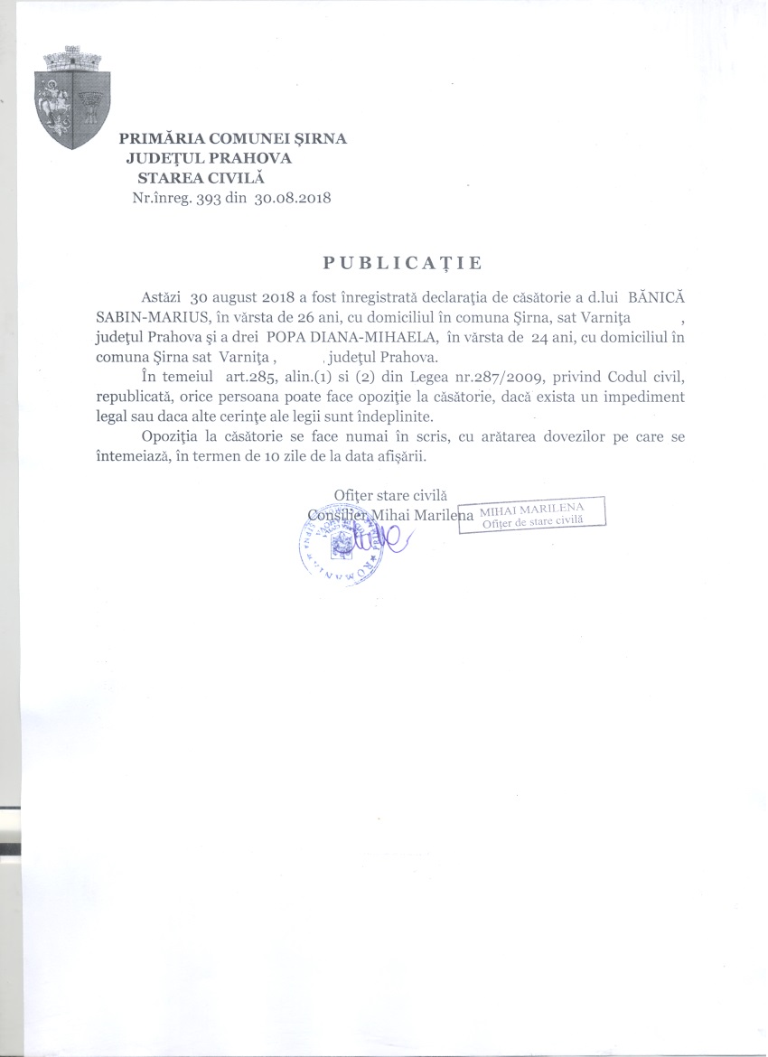 14) Publicatie de casatorie nr. 393 din data de 30.08.2018 (Banica Sabin Marius si Popa Diana Mihaela)