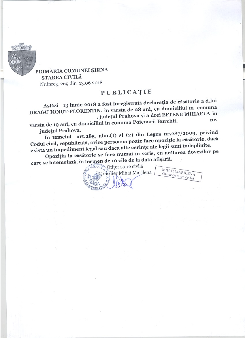 6) Publicatia de casatorie nr. 269 din data de 13.06.2018 (Dragu Ionut-Florentin si Eftene Mihaela)