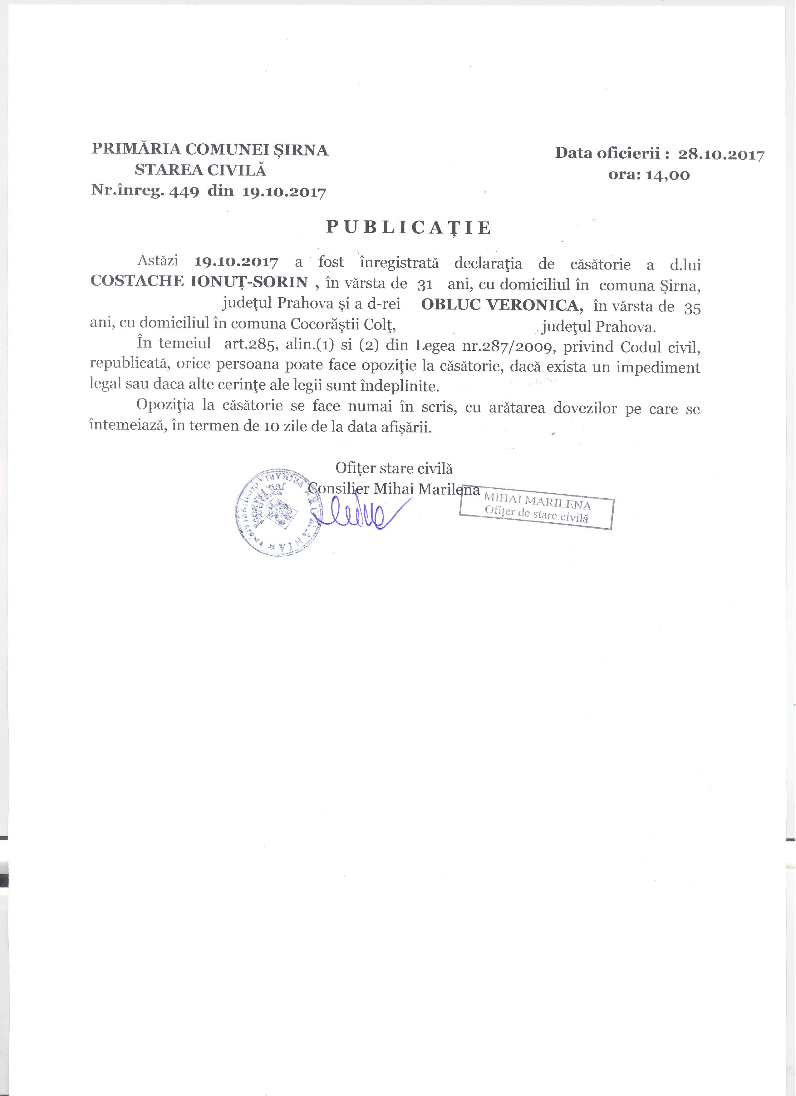 16) Publicatia de casatorie nr. 449 din data de 19.10.2017 (Costache Ionut-Sorin si Obluc Veronica)