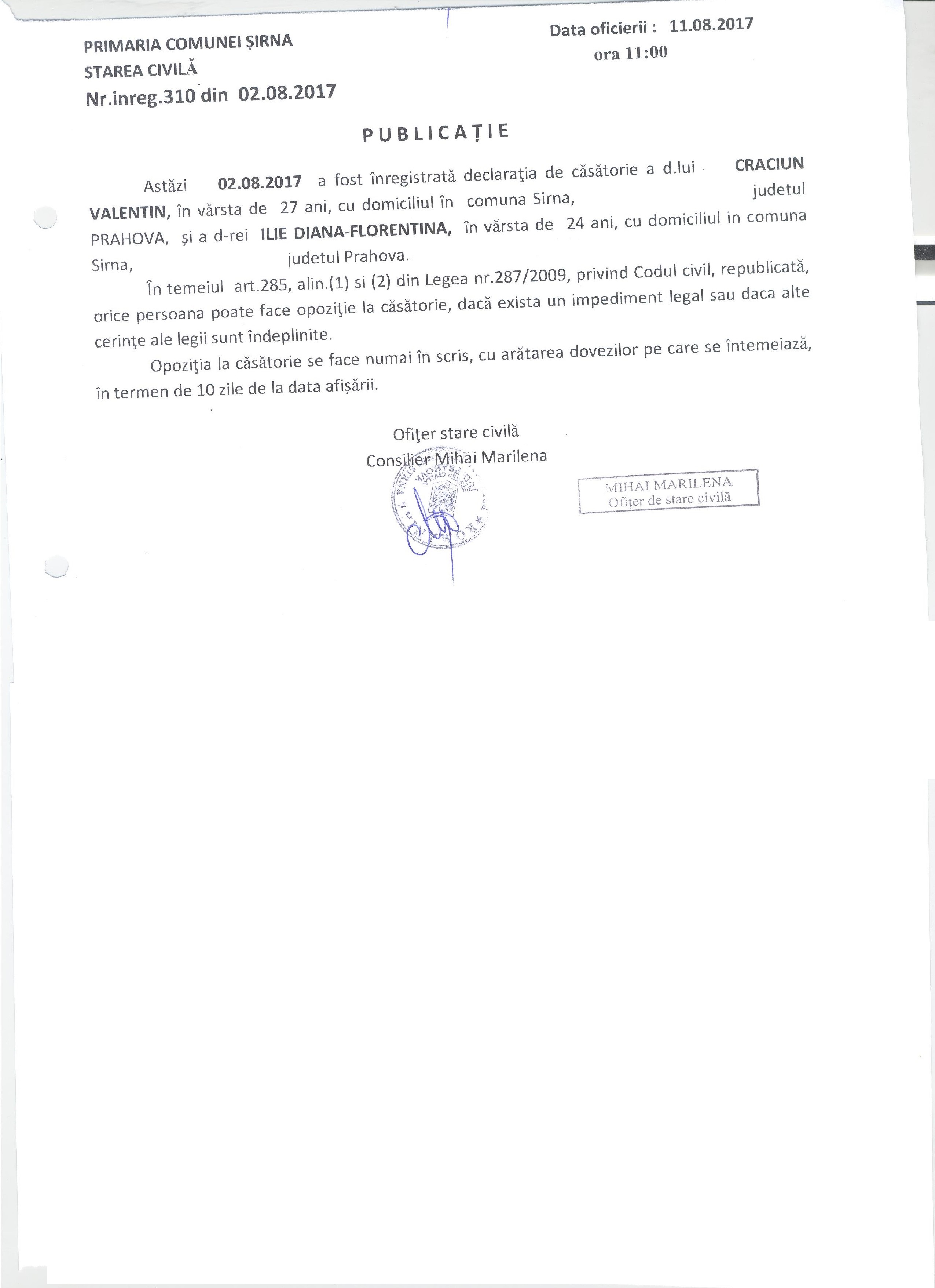 10) Publicatia nr. 310 din data de 02.08.2017 (Craciun Valentin si Ilie Diana-Florentina)