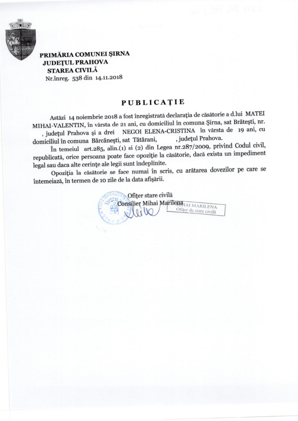 1) Publicatia de casatorie nr. 7 din data de 04.01.2019 (Radu Petre Razvan si Ilinca Elena Adriana)
